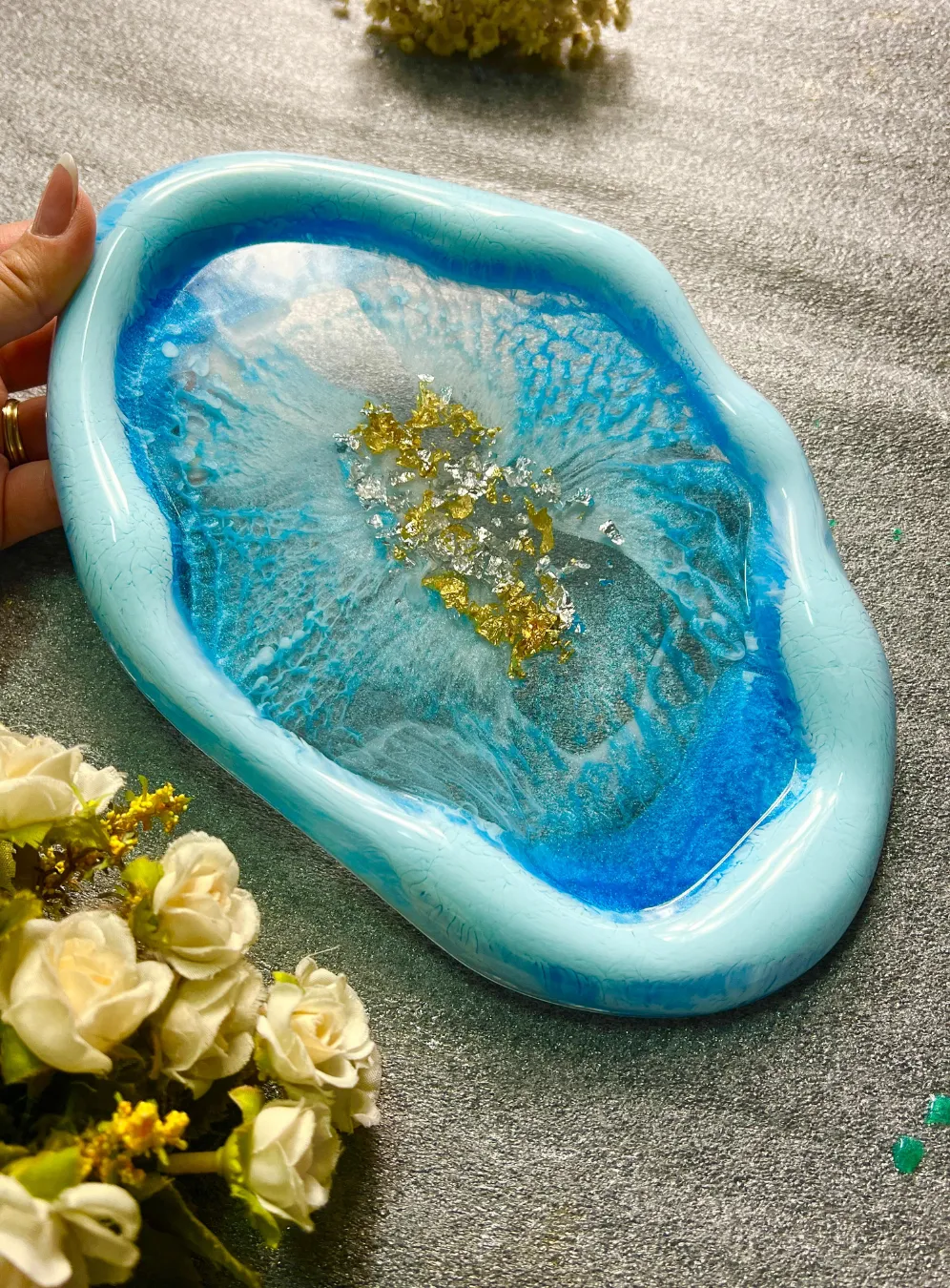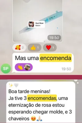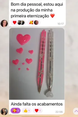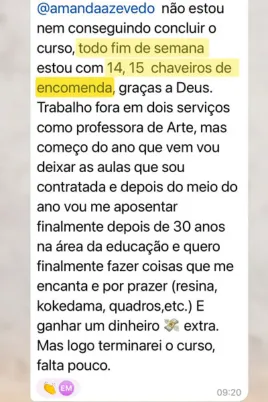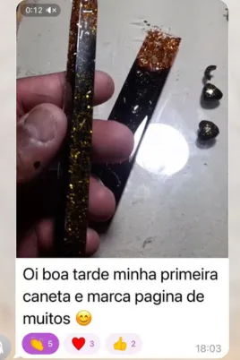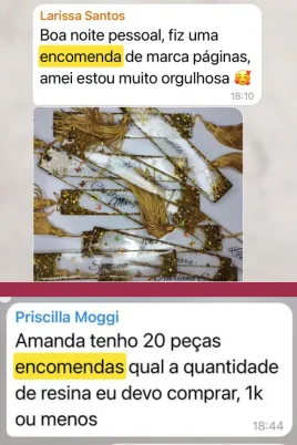 Além de ensinar no formato online, Amanda também ministra aulas presenciais. Seu maior orgulho é ver alunas que começaram do zero hoje criando suas próprias marcas, vendendo suas peças e alcançando independência financeira através da resina.