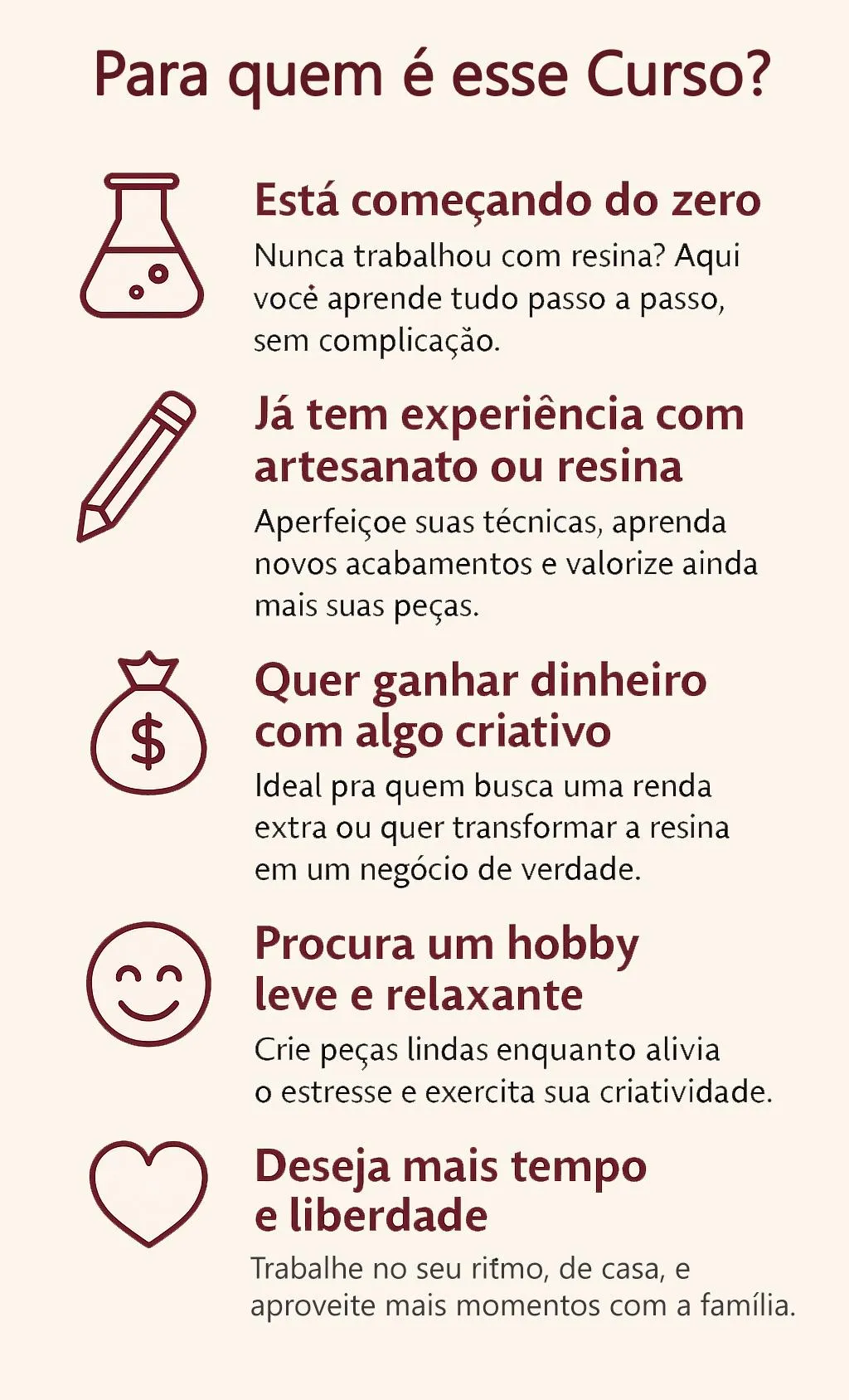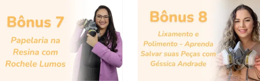 Com certeza! O curso foi pensado para iniciantes até chegar no avançado, com explicações passo a passo, linguagem simples e projetos práticos. Mesmo que você nunca tenha mexido com resina, vai conseguir acompanhar tudo com facilidade.