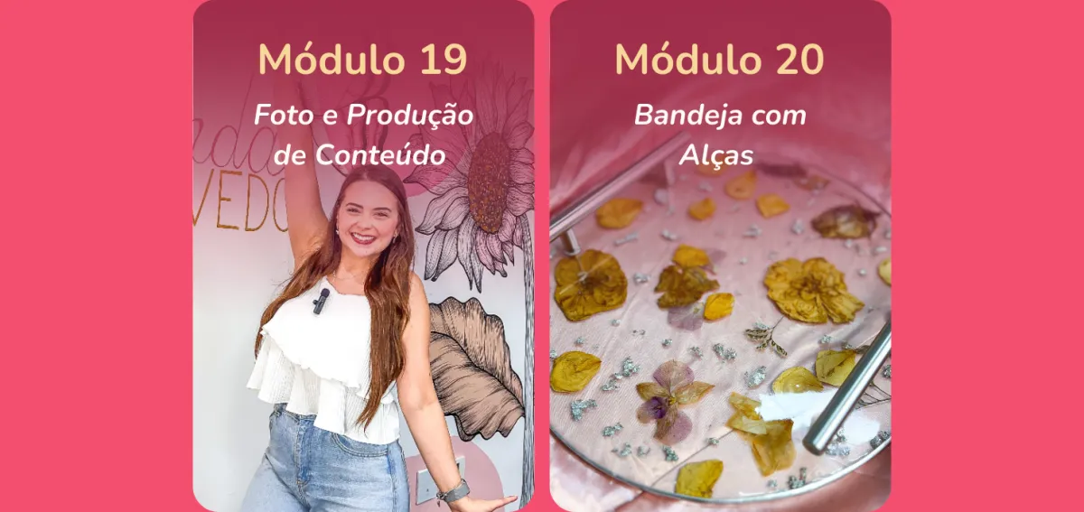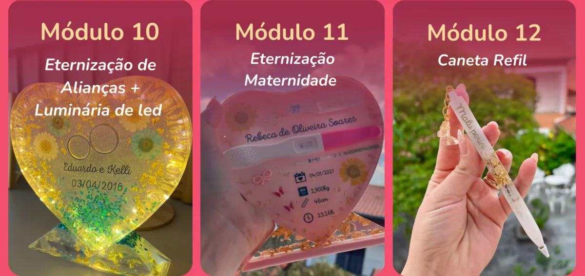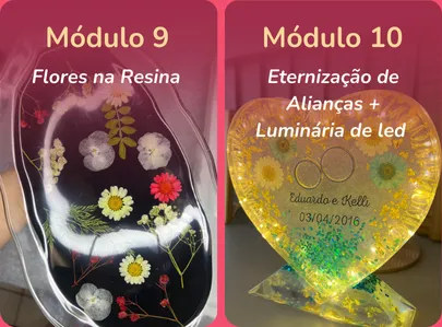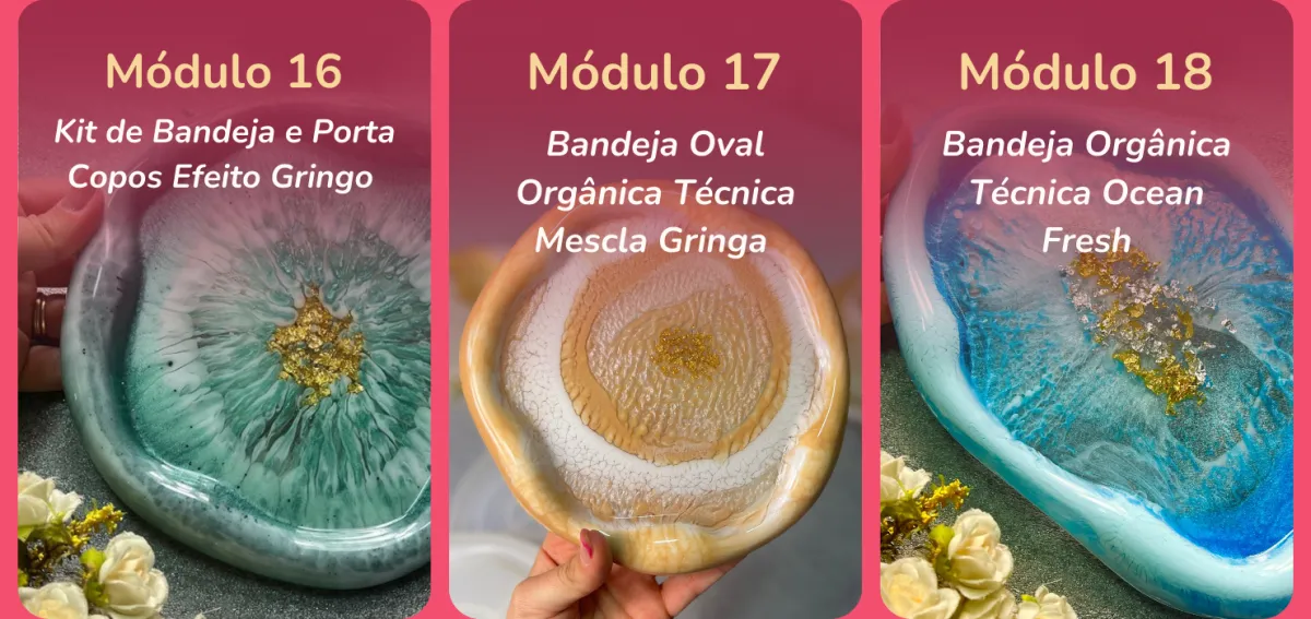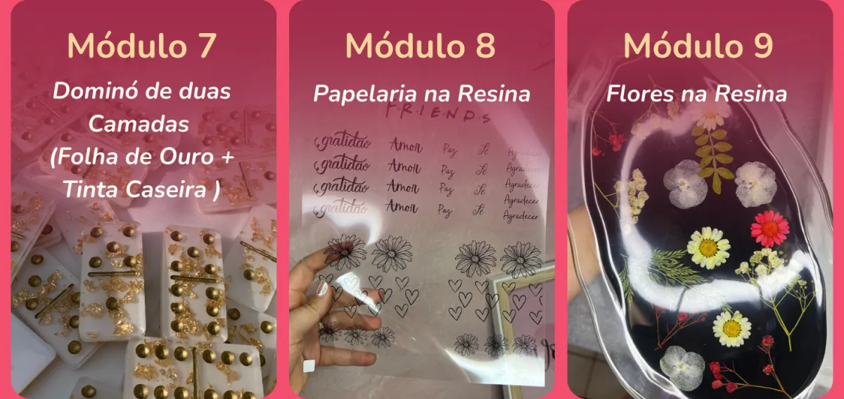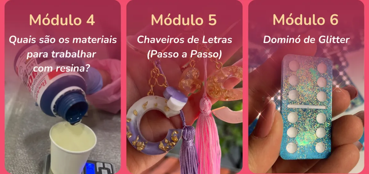 Com certeza! O curso foi pensado para iniciantes até chegar no avançado, com explicações passo a passo, linguagem simples e projetos práticos. Mesmo que você nunca tenha mexido com resina, vai conseguir acompanhar tudo com facilidade.